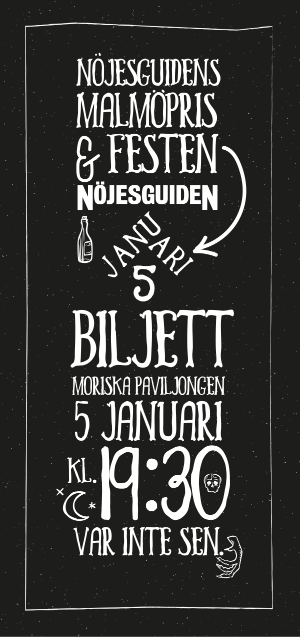I mer än 20 år har Malmös roligaste människor strålat samman och tillsammans gjort den 5 januari till hela årets mest emotsedda festdatum. Ingen biljett = Ingen fest. Som formgivare i Malmö är detta ett hedersuppdrag eftersom den grafiska profilen görs om varje år. Jag tog fram en ganska okult och hedonistisk profil med en samling illustrationer. Lite brag är väl att samma profil användes tre år i rad.